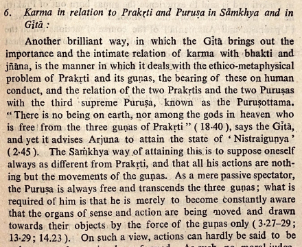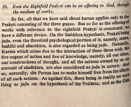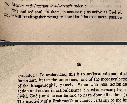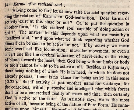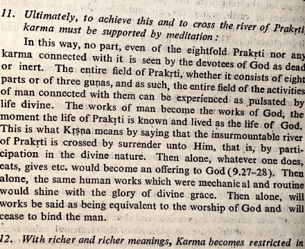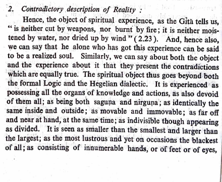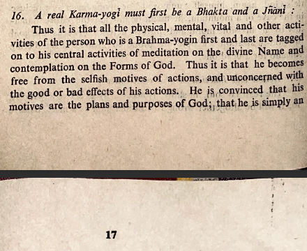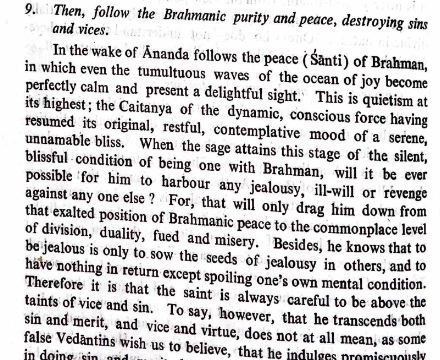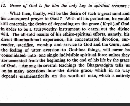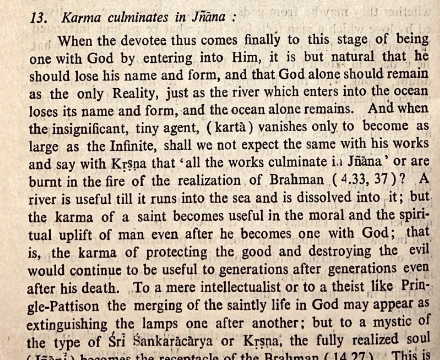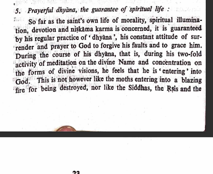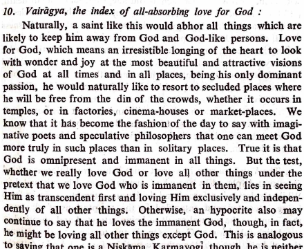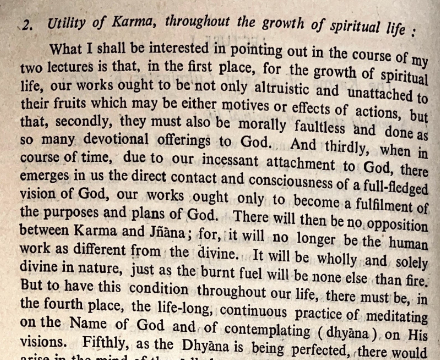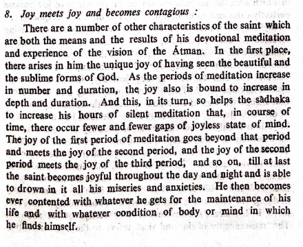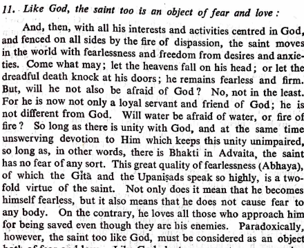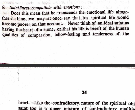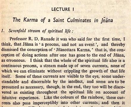 I pointed out in my yesterday’s lecture as to how Karma, which is generally considered as different from the Jiva or the Kartă and as being jada in nature, becomes assimilated with the divine nature on account of its being not only an integral part in the moral and the spiritual progress of man but also on account of its being an instrument of executing the plans and the purposes of God. It becomes the work of God; and it is the saint who alone like Arjuna knows and does exactly as God would wish him to do. So, in my yesterday’s lecture, I have described at full length only one point of excellence of a real saint; or, I may say I tried to lead you along the windings of one of the seven currents of spiritual life which ultimately culminated in the main current of Jñana. As the time at my disposal is short, I shall remain content today by describing only a broad outline of the remaining six aspects of that saintly life. As all the seven aspects of the spiritual life are knit together very closely, or, to put it differently, as the seven currents mingle into each other, one gets necessarily the taste of them all simultaneously. That is why in discussing the nature of karma, yesterday, we inevitably discussed to some extent the nature of Niti, Bhakti, Jñāna and Dhyana. Today, I shall speak more of these four aspects first, and then briefly refer to Vairagya and K.